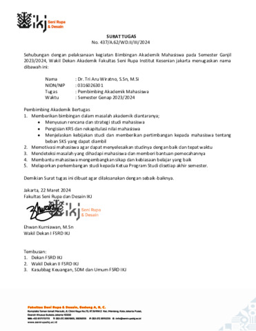 Wiratno, Aru Tri (2024) Surat tugas Sebagai Pembimbing Akademik. Fakultas Seni Rupa dan Desain Institut Kesenian Jakarta.