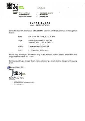 tobing, suzen Koordinator Peminatan Produksi Prodi S.1 Semester Genap 2023-2024. Fakultas Film dan Televisi-Institut Kesenian Jakarta. (Unpublished)