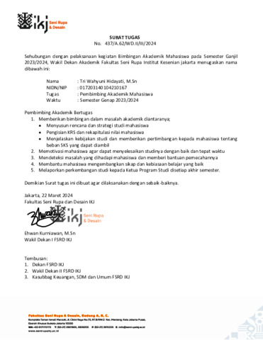 Hidayati, Wahyuni Tri (2024) Surat Tugas Sebagai Pembimbing Akademik. Fakultas Seni Rupa dan Desain Institut Kesenian Jakarta.