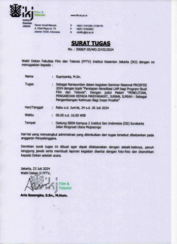 Supriyanta, - Surat Tugas Narasumber Munas Prosfisi (ISI Surakarta). Fakultas Film dan Televisi. (Unpublished)