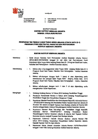 simanjuntak, robinsar 2024 R - 078 SK Penetapan Tim Penguji Ujian Tugas Akhir Mahasiswa Prodi Seni Teater FSP Genap 2023-2024. INSTITUT KESENIAN JAKARTA. (Unpublished)