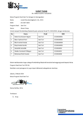 Kusumaningdiah, Lusiati Surat Tugas Pembimbing Akademik Semester genap 2023-2024. Fakultas Seni Pertunjukan IKJ.