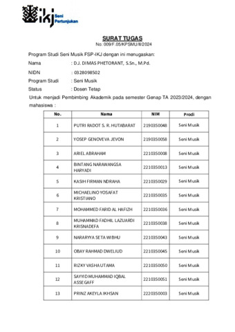 Phetorant, DJ. Dimas Surat Tugas Pembimbing Akademik Semester Genap 2023/2024. Fakultas Seni Pertunjukan IKJ.