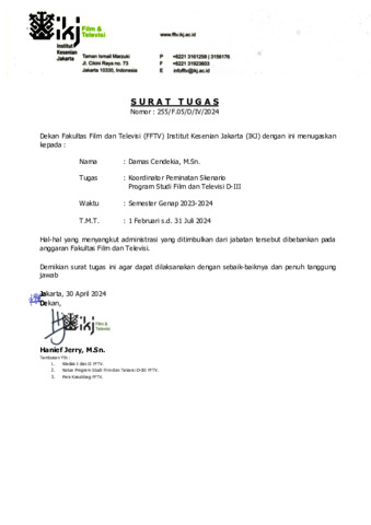 Cendekia, Damas Surat Tugas Pembimbing Akademik. FFTV IKJ. (Unpublished)