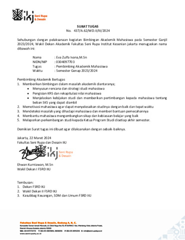 ivana Zulfa, Eva (2024) Surat Tugas Pembimbing Akademik. Fakultas Seni Rupa dan Desain Institut Kesenian Jakarta.