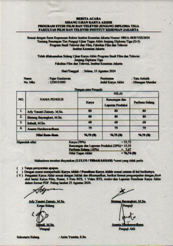 bintang, bayangkari berita acara penguji Fajar 2024. Fakultas Film dan Televisi. (Unpublished)