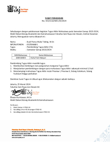 Tobing, Budi (2024) Surat Tugas Pembimbing TA. Fakultas Seni Rupa dan Desain Institut Kesenian Jakarta.