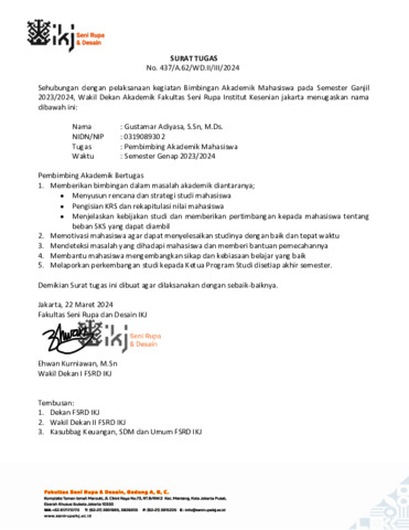 Adiyasa, Gustamar (2024) Surat Tugas Pembimbing Akademik. Fakultas Seni Rupa dan Desain Institut Kesenian Jakarta.