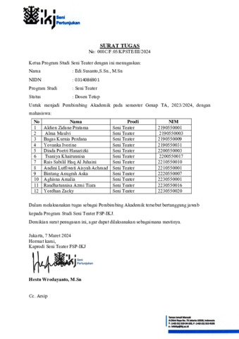 susanto, edi Surat tugas pembimbing akademik. Fakultas Seni Pertunjukan IKJ.