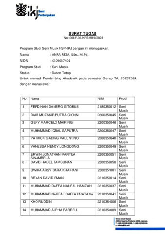 Amra Reza, S.Sn.,M.Pd, Amra Surat Tugas Pembimbing Akademik semester genap 2023-2024. Institut Kesenian Jakarta. (Unpublished)