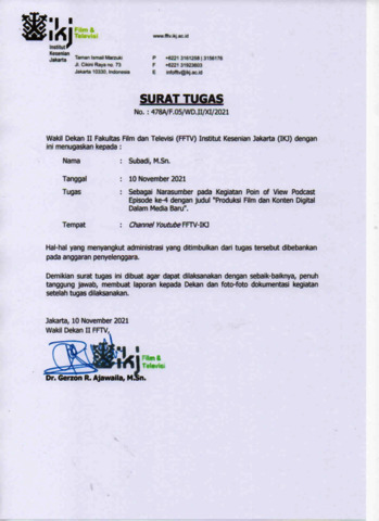 Subadi, - Surat Tugas. Fakultas Film & Televisi - IKJ.