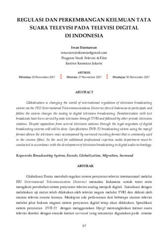 ABSTRACT Globalization is changing the world of international regulation of television broadcasting sistem via the ITU (International Telecommunications Universe) forced Indonesia to participate and follow the sistem changes the analog to digital television broadcasting. Familiarization with test broadcasts have been carried by state television through TVRI and followed by other private television stations. Despite opposition from several television stations through the legal migration of digital broadcasting sistems will still be done. Specifications DVB-T2 broadcasting sistem using the mpeg2 format allows the television voice accompanied by surround encoding format that is commonly used in the cinema (film). So the need for additional professional expertise audio department must be conducted in accordance with the development of television broadcasting in digital audio technology. Keywords: Broadcasting System, Encode, Globalization, Migration, Surround