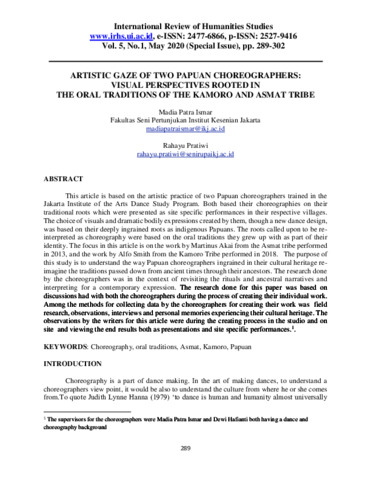 Ismar, Madia Patra ARTISTIC GAZE OF T TISTIC GAZE OF TWO PAPUAN CHOREOGRAPHERS: VISU AN CHOREOGRAPHERS: VISUAL PERSPECTIVES ROOTED IN THE ORAL TRADITIONS OF THE KAMORO AND ASMAT TRIBE. International Review of Humanities Studies, 5 (3).