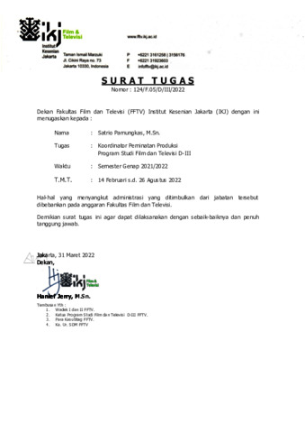 pamungkas, satrio Surat Tugas KPPA Sem Genap 2021-2022. Fakultas Film dan Televisi. (Unpublished)