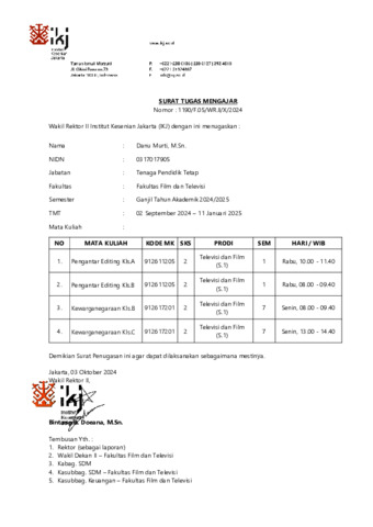Murti, Danu Laporan Mengajar Pengantar Editing Kelas A Gasal 2024-2025 Danu Murti. Fakultas Film dan Televisi - IKJ. (Unpublished)