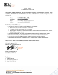 Fadlia, Adlien (2024) Surat Tugas Sebagai Pembimbing Akademik. Fakultas Seni Rupa dan Desain Institut Kesenian Jakarta.