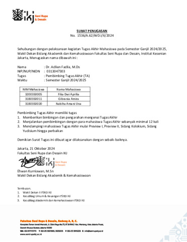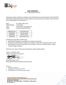 Fadlia, Adlien (2024) Surat Tugas Sebagai Pembimbing Tugas Akhir. Fakultas Seni Rupa dan Desain Institut Kesenian Jakarta.