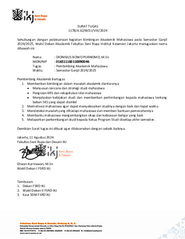Bowo, Dionisius (2024) Surat Tugas Pembimbing Akademik (PA). Fakultas Seni Rupa dan Desain Institut Kesenian Jakarta.