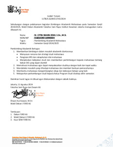 Dewi Smara, Citra (2024) Surat Tugas Sebagai Pembimbing Akademik. Fakultas Seni Rupa dan Desain Institut Kesenian Jakarta.