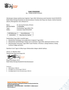 Purnama, Ika Yuni (2024) Surat Tugas Sebagai Pembimbing Tugas Akhir. Fakultas Seni Rupa dan Desain Institut Kesenian Jakarta.