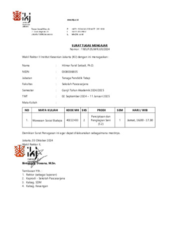 Farid, Hilmar Laporan mengajar Matakuliah Wawasan Sosial Budaya. Sekolah Pascasarjana IKJ. (Unpublished)