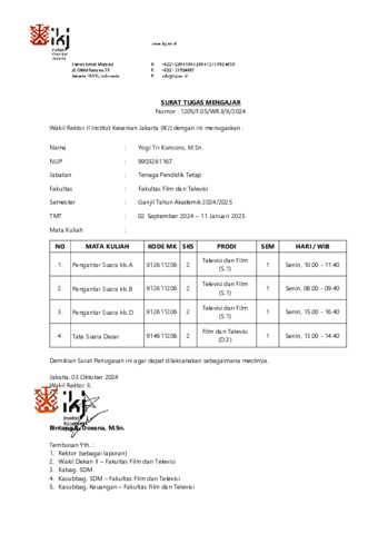 Yogi Tri Kuncoro, Yogi Surat Tugas, Presensi Mahasiswa dan Daftar Nilai MK Pengantar Suara Kelas B. Fakultas Film dan Televisi IKJ. (Unpublished)