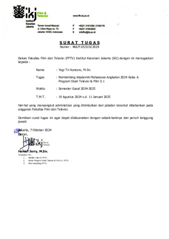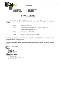 Yogi Tri Kuncoro, Yogi Surat Tugas KPPA Prodi S.1 Semester Gasal 2024-2025. Fakultas Film dan Televisi IKJ. (Unpublished)