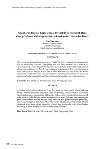Fajar, Nuswantoro (2024). Penyebaran Ideologi Islam Sebagai Perspektif Hermeunetik Hans-Georg Gadamer terhadap Analisis Animasi Series "Riko The Series". Jurnal Jelajah Sinema. Jurnal Jelajah Sinema.