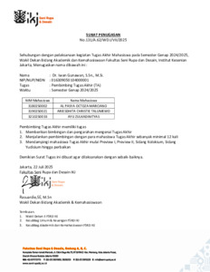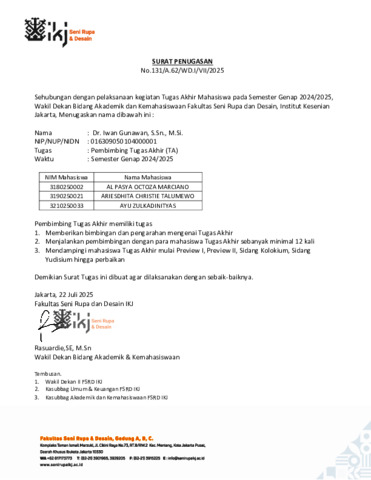 Gunawan, Iwan Surat Penugasan Iwan Gunawan sebagai Pembimbing TA Semester Genap 2024/2025. Institut Kesenian Jakarta.