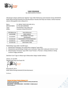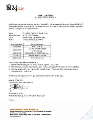 Tjahjawulan, Indah Surat Penugasan Indah Tjahjawulan sebagai Pembimbing TA Semester Genap 2024/2025. Institut Kesenian Jakarta.