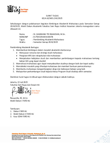 Rahardia Tri, Bambang (2025) Surat TUgas Sebagai Pembimbing Akademik. Fakultas Seni Rupa dan Desain Institut Kesenian Jakarta.