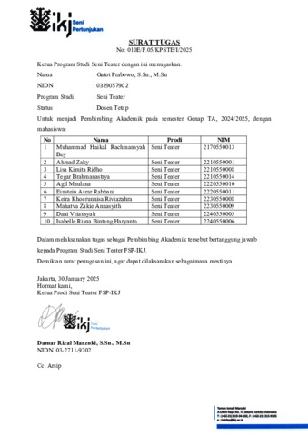 prabowo, gatot Surat Tugas PA Genap 2024. INSTITUT KESENIAN JAKARTA.