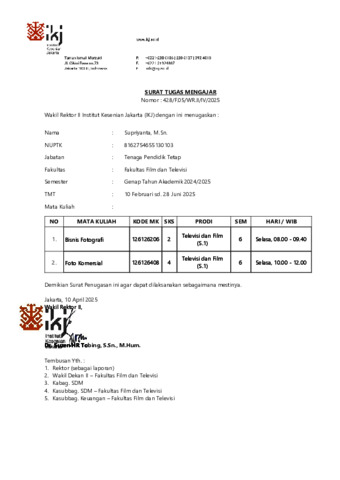Supriyanta, - Surat Tugas Mengajar, Presensi & Nilai Bisnis Fotografi. Fakultas Film dan Televisi. (Unpublished)
