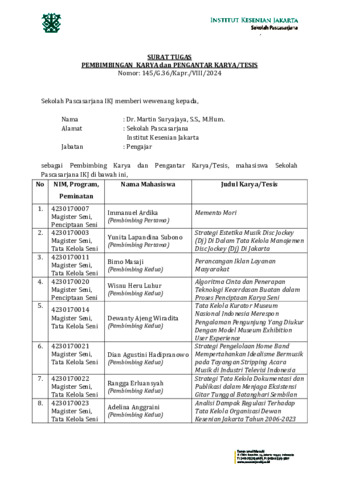 Suryajaya, Martin Surat Tugas Pembimbingan Mahasiswa 2024/2025 Genap. Sekolah Pascasarjana IKJ.