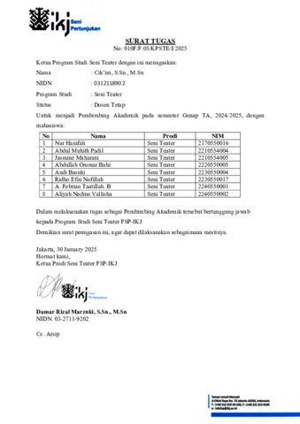 cikim, cikim SURAT TUGAS PEMBIMBING AKADEMIK CIKIM GENAP 2024. Fakultas Seni Pertunjukan Institut Kesenian Jakarta.