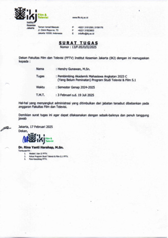 Gunawan, Hendry Surat Tugas Koordinator Peminatan/Pembimbing Akademik (KP/PA) Semester Genap Tahun Akademik 2024/2025 Program Studi Televisi dan Film S.1. Fakultas Film dan Televisi. (Unpublished)
