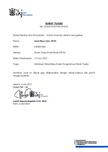 Amra Reza, S.Sn.,M.Pd, Amra Amra Reza,S.Sn.,M.Pd Surat Tugas pembuatan Diktat kuliah Pengetahuan Musik Tradisi. Fakultas Seni Pertunjukan Institut Kesenian Jakarta. (Unpublished)
