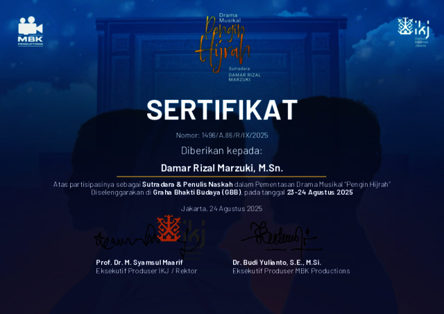 Marzuki, Damar Rizal (2025) Sertifikat Sutradara & Penulis Naskah Drama Musikal Pengin Hijrah. Institut Kesenian Jakarta.