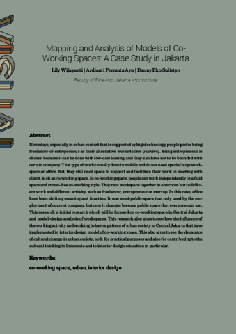 Abstract Lily Wijayanti | Ardianti Permata Ayu | Danny Eko Sulistyo Faculty of Fine Arts, Jakarta Arts Institute Nowadays, especially in urban context that is supported by high technology, people prefer being freelancer or entrepreneur as their alternative works to live (survive). Being entrepreneur is chosen because it can be done with low-cost leasing, and they also have not to be bounded with certain company. That type of works usually done in mobile and do not need special large workspace or office. But, they still need space to support and facilitate their work in meeting with client, such as co-working space. In co-working space, people can work independently in a fluid space and stress-free co-working style. They rent workspace together in one room but in different work and different activity, such as freelancer, entrepreneur or startup. In this case, office have been shifting meaning and function. It was semi-public space that only used by the employment of current company, but now it changes become public space that everyone can use. This research is initial research which will be focused on co-working space in Central Jakarta and model-design analysis of workspaces. This research also aims to see how the influence of the working activity and working behavior pattern of urban society in Central Jakarta that have implemented in interior design model of co-working space. This also aims to see the dynamics of cultural change in urban society, both for practical purposes and also for contributing to the cultural thinking in Indonesia and to interior design education in particular.