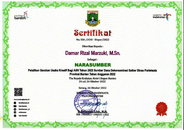 Marzuki, Damar Rizal (2022) Sertifikat Narasumber Pelatihan Gerakan Usaha Kreatif bagi ASN. Dinas Pariwisata Provinsi Banten.