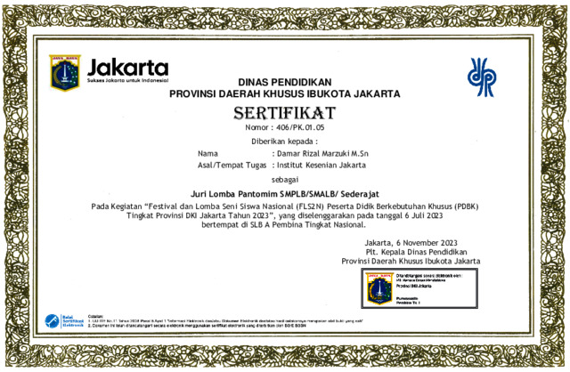 Marzuki, Damar Rizal (2023) Sertifikat Juri Pantomim SMPLB/SMALB FSL2N. Dinas Pendidikan Provinsi DKI Jakarta.