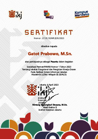 prabowo, gatot SERTIFIKAT Peserta Sosialisasi PermenPANRB Nomor 1 Tahun 2023 Tentang Jabatan Fungsional dan Pengisian Kinerja Dosen Pada Aplikasi Sistem Informasi Jabatan Akademik LLDikti Wilayah III (SIJALI3. Institut Kesenian Jakarta.