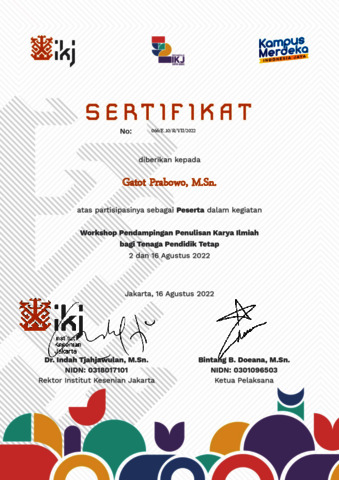 prabowo, gatot sertifikat peserta workshop penulisan pendampingan karya ilmiah. Institut Kesenian Jakarta.