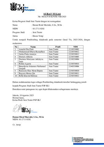 Marzuki, Damar Rizal Surat Tugas Pembimbingan Akademik - Damar Rizal Marzuki - Gasal 2025. Prodi Seni Teater FSP IKJ.