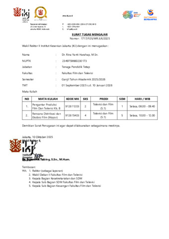 Harahap, M.Sn., Rinayanti Bukti Ajar Mata Kuliah Rencana Distribusi dan Eksibisi Film (Mayor) Semester Ganjil 2025/2026. Fakultas Film dan Televisi. (Unpublished)