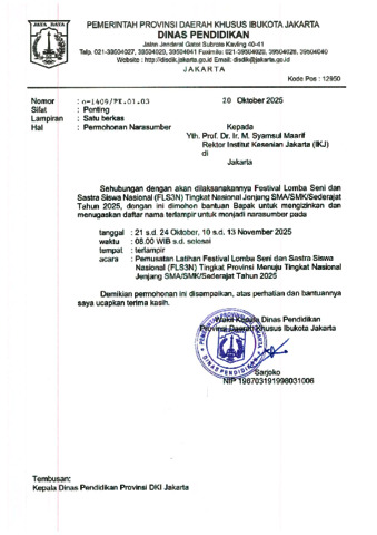 Supriyanta, - Surat Permohonan Narasumber, ST dan Materi: Pemusatan Latihan FLS3N Tingkat Provinsi Menuju Nasional Jenjang SMA/SMK Sederajat Tahun 2025 - DISDIK DKI. fftv ikj. (Unpublished)