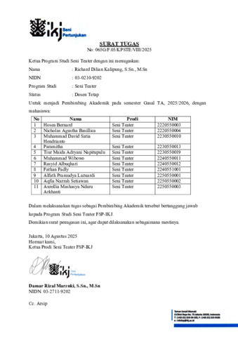 kalipung, richard Surat Tugas PA Gasal Richard D. Kalipung M.Sn. Institut Kesenian Jakarta.