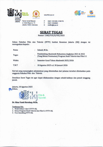 Subadi, - Surat Tugas PA Gasal 25/26. Fakultas Film & TV - Institut Kesenian Jakarta. (Unpublished)