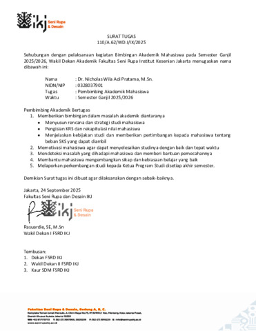 Adi Pratama Willa, Nicholas (2025) Surat Tugas Pembimbing Akademik. Fakultas Seni Rupa dan Desain Institut Kesenian Jakarta.
