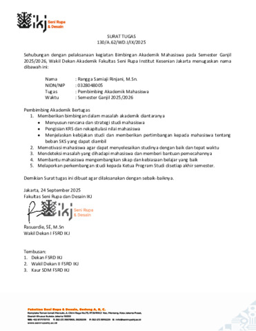 Rinjani Samiaji, Rangga (2025) Surat Tugas Pembimbing Akademik. Fakultas Seni Rupa dan Desain Institut Kesenian Jakarta.